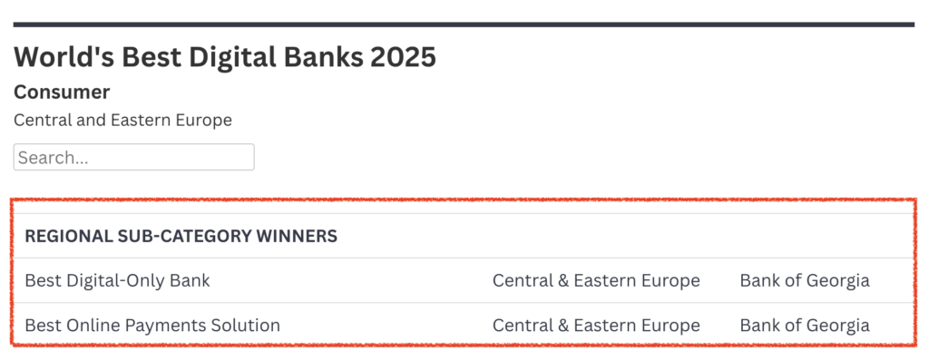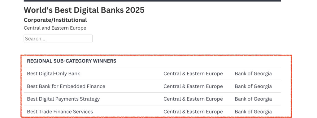 BANK OF GEORGIAは6年連続で世界最優秀デジタルバンクとして表彰を受けている(ヨーロッパ全土でも評価が高い)