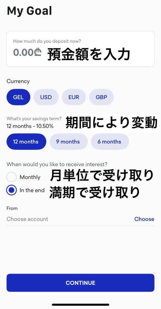 定期預金の最低残高は100 GEL/USD/EUR/GBPです。
